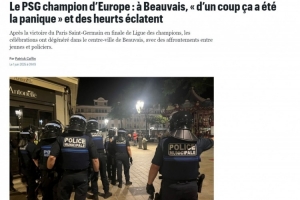 在欧冠决赛中,巴黎圣日耳曼5-0大胜国米,成功夺冠。巴黎圣日耳曼的球迷们在法国各地庆祝,但在博韦却发生了球迷骚乱。当时一群球迷先是欢呼夺冠,然后开始侮辱马赛人,并来到阿歇特广场。而在拉法耶百货附近,有大约20名防暴警察拿着盾牌维持秩序,之后局势突然变得紧张。
