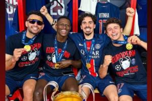 B费晒出拉莫斯、门德斯、维蒂尼亚、内维斯在更衣室与欧冠奖杯的合照,配文:从葡萄牙到全世界。