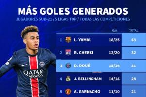 五大联赛U22球员进球+助攻榜:亚马尔43次居首 杜埃31次升第三