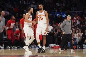 当布伦森和唐斯同时在场时,尼克斯进攻效率115.4,防守效率117.2,净效率值-1.8;