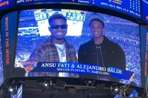 法蒂和巴尔德现场观看尼克斯对阵步行者的NBA季后赛,现场大屏幕也放出他们的照片,巴萨官方社媒写道:“法蒂与巴尔德在麦迪逊广场花园欣赏NBA比赛。”