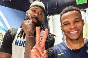 体育资讯06月04日讯 今日,掘金官推更新了社交媒体,发布了球队中锋德安德烈-乔丹与球队后卫拉塞尔-威斯布鲁克的合照,配文:“表情包库存告急📂!”