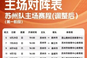 6月29日第5轮第29场苏州队VS扬州队,比赛场地移至昆山市奥体中心体育场,开球时间调整为6月29日19:00。