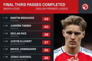 体育资讯4月1日讯 Squawka统计了球员在3月份英超比赛中的进攻三区成功传球次数,并列出榜单,阿森纳包揽前三名。