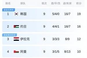 积分榜方面,韩国19分领跑,约旦16分第二,两队携手晋级世界杯;伊拉克12分第三,阿曼10分第四,巴勒斯坦9分第五,科威特5分垫底。