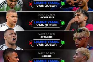 如果比较球员个人层面,亚马尔已经在最近6场与姆巴佩的交手中取得全胜。