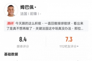 体育资讯6月6日讯 欧国联半决赛,法国4-5西班牙,无缘决赛。姆巴佩首发出战,传射建功,另外他还有3次过人成功,2次关键传球,评分8.4。