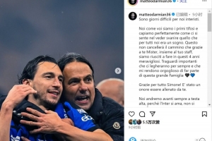 达米安社媒晒出与小因扎吉的合照,配文:“这对我们国米球迷来说是艰难的日子。我们与你一样,作为最忠实的球迷,完全理解眼睁睁看着梦想破灭的感觉。这不会抹去过去四年里,在你——我们的主帅——和你的团队带领下,我们所取得的辉煌成就。这些重要的成就将永远把我们连结在一起,让我为自己是这个伟大大家庭的一员感到骄傲 🖤💙
