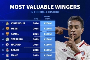 体育资讯6月6日讯 德国转会市场列出了边锋历史最高身价排名,维尼修斯2亿欧居首,梅西、亚马尔1.8亿欧次席,奥利塞1亿欧上榜。