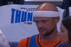 赛前,镜头捕捉到现场来了一位球迷,发型和装扮模仿了雷霆悍将卡鲁索。