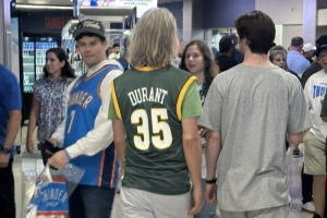 赛前镜头捕捉到,有球迷身穿杜兰特超音速时期的球衣到场。