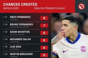 体育资讯4月1日讯 Squawka统计了3月份球员在英超创造机会的次数,并列出榜单,恩佐8次居首,B费7次第二。
