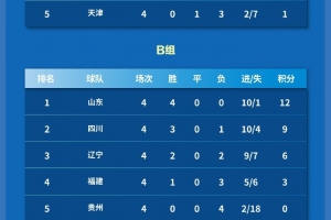 山东队延续出色状态,以3-1战胜福建队,资格赛4战全胜进10球仅丢1球昂首挺进决赛阶段。福建队虽然输球,但作为两个成绩最好的小组第四之一收获宝贵的决赛阶段名额。在一场进球大战中,四川队4-2战胜辽宁队,四川队3胜1负获得小组第二,辽宁队2胜2负屈居第三。贵州队小组垫底无缘决赛。