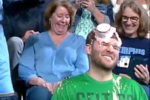 比赛期间,灰熊吉祥物将几个冰淇淋直接浇在了一名身穿绿军球衣的观众头上,小哥满脸笑容情绪异常稳定。