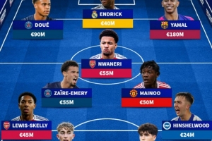 后卫:斯凯利(阿森纳,4500万欧)、怀森(皇马,6000万欧)、库巴西(巴萨,7000万欧)、辛谢尔伍德(布莱顿,2400万欧)