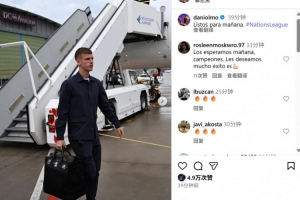 西班牙球员奥尔莫在个人社媒晒出一张抵达慕尼黑的照片,配文写道:“为明天比赛做好准备。”