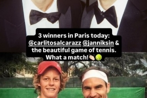 体育资讯6月9日讯 费德勒更新社媒,祝贺阿尔卡拉斯和辛纳联手奉献了精彩的法网决赛。