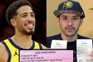 前者的赔率是125倍,后者的赔率是30倍,两个选项他各买了1000美元,目前已经净赚了30000美元(东部冠军),如果步行者最终夺得总冠军,他还能再赚12.5万美元。