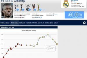 卡马文加巅峰身价出现在他21岁时,去年6月他的身价1亿欧,排名世界足坛前列。然而过去一年他的身价逐渐从1亿欧降至8000万、7000万,直至目前的6000万欧。