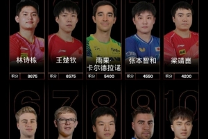 男单方面,中国队球员林诗栋、王楚钦位列前二,梁靖崑位列第五,向鹏位列第八。