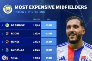曼城中场引援费用排名: