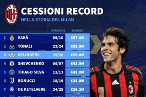 米兰出售球员转会费榜:卡卡6700万欧居首,托纳利、赖因德斯前三
