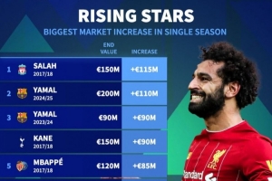 1、萨拉赫(利物浦):+1.15亿欧(1.5亿欧),17-18赛季