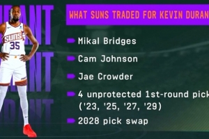 太阳送出米卡尔-布里奇斯、卡梅隆-约翰逊、克劳德、四个首轮签和一个2028年的选秀权互换,从篮网得到杜兰特和TJ-沃伦。
