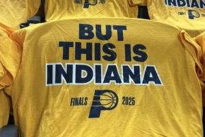 赛前,场馆内的座位上铺满了步行者的黄色助威T恤,上面印有“但,这里可是印第安纳!”的字样。