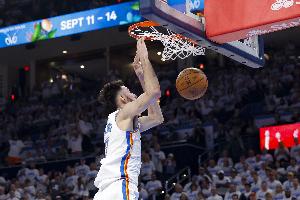 首节比赛,雷霆内线霍姆格伦状态火热,得分已经上双,在8分半的时间里,投篮5中4,三分球1中0,罚球6中5,拿到13分4篮板1抢断的数据,正负值+7。