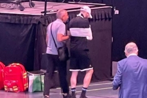 赛后镜头拍到阿拉基肩膀做了固定,他走起路来很不自然。