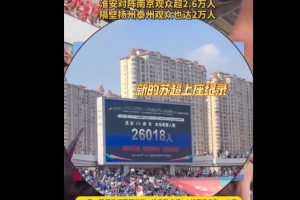 6月14日,苏超常规赛第四轮,淮安队主场1-1战平南京队,本场比赛现场观众超2.6万人,创造了新的苏超上座纪录。