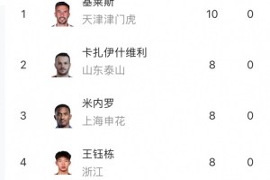 基莱斯在对阵泰山队的比赛中打入一球,以10球数据继续领跑射手榜。目前射手榜TOP5如下: