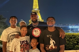 布莱斯晒出一张他和父亲勒布朗、哥哥布朗尼、母亲萨瓦娜和妹妹Zhuri去年奥运会期间在巴黎的合影,并写道:“父亲节快乐❤️🐐”