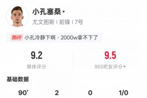 体育资讯6月19日讯 世俱杯小组赛G组第一轮,尤文图斯5-0战胜艾因。小孔塞桑首发出战,打进2球,5次过人成功,还送出2次关键传球,评分9.2全场最高。