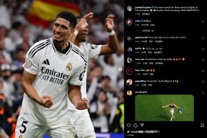 贝林厄姆社媒晒出庆祝胜利的照片,配文:“伯纳乌这样的夜晚没有更多言语形容,又一场决赛即将来临!”