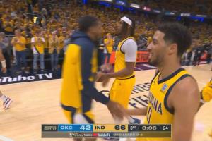 两队半场比分——步行者64-42雷霆(雷霆投篮6-0,步行者投篮9-1)