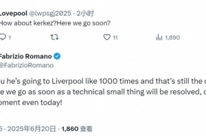 罗马诺社媒报道维尔茨接受利物浦体检的消息,有球迷询问科尔克兹的交易进展,罗马诺回复道:“我已经跟你们说过一千次他将加盟利物浦了,现在情况依然如此。一旦技术上的小问题解决,就可以here we go,随时可能发生,甚至可能在今天!”