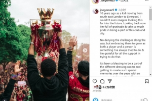 乔-戈麦斯社媒晒出举起英超奖杯的照片,并写道:“10年前,作为一个从伦敦东南部来到利物浦的孩子,我无法想象这么遥远的未来。如今回首往事,我充满感激之情,并为自己成为这家俱乐部和这座城市的一员感到无比自豪。