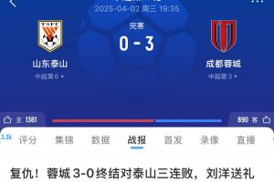 泰山面对联赛前五无一胜绩!1-6国安、0-1申花、1-1海港,被蓉城双杀(0-3/1-3)!