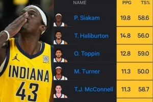 据统计,总决赛前6场,步行者无人场均得分能超过20分,但有8人场均得分上双,具体为: