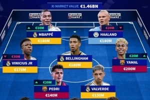 前锋:维尼修斯(皇马,1.7亿欧)、姆巴佩(皇马,1.8亿欧)、哈兰德(曼城,1.8亿欧)、亚马尔(巴萨,2亿欧)
