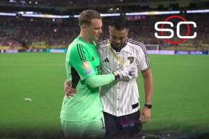 赛后ESPN晒照,诺伊尔与罗梅罗拥抱,罗梅罗因伤此前做了膝关节手术。