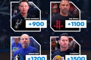 体育资讯6月22日讯 博彩网站开出了2026年最佳教练的赔率,马刺主教练米奇-约翰逊排名第一,火箭主教练乌度卡第二,独行侠基德第三,湖人雷迪克第四。