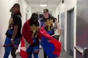 赛后,雷霆球员多特身披加拿大+海地的国旗,满脸笑容地走在球员通道。