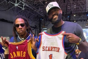 詹姆斯签名的是自己骑士时期的23号球衣,Jay-Z签名的是尼克斯配色的“S.Carter”球衣,S.Carter是Jay-Z一张专辑名包含的名字。
