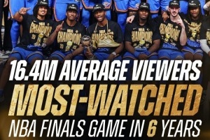 体育资讯6月24日讯 昨天,雷霆抢七103-91战胜步行者,成功夺冠。据NBA官方统计,这场比赛是近6年来,收视率最高的总决赛。