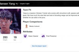 雅虎给杨瀚森的模板是武切维奇,并点评说:“杨是一个巨大的中国七尺中锋,有着老派的得分、传球、篮板能力。但他的脚下速度和投射能进步多少,将取决于他能在联盟里待多久。”