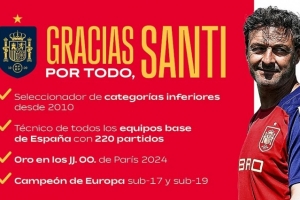 在执教西班牙各级国家队的220场比赛中(10场U15、16场U16、105场U17、14场U28、39场U19、30场U21和6场奥国奥),桑蒂为西班牙足球做出了巨大贡献。西班牙足协全体员工对他的付出表示衷心感谢,并祝愿他在新的职业生涯中一切顺利。