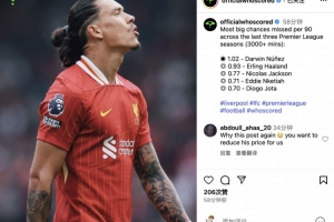 体育资讯6月27日讯 利物浦前锋努涅斯今夏被推至转会市场,这位乌拉圭前锋曾在2022年顶着8500万欧身价加盟红军。据WhoScored数据统计,过去三个英超赛季中(出场时间超过3000分钟),场均错失绝佳机会次数最多的球员中,努涅斯以1.02次居首,哈兰德0.93次第二。